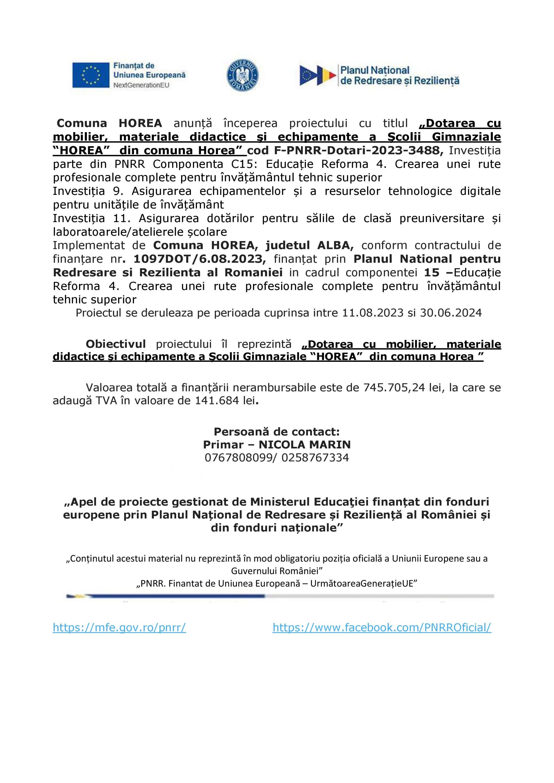 Comunicat de presa privind proiectul cu titlul „Dotarea cu mobilier, materiale didactice și echipamente a Scolii Gimnaziale „HOREA” din comuna HOREA cod F-PNRR-Dotari-2023-3488″
